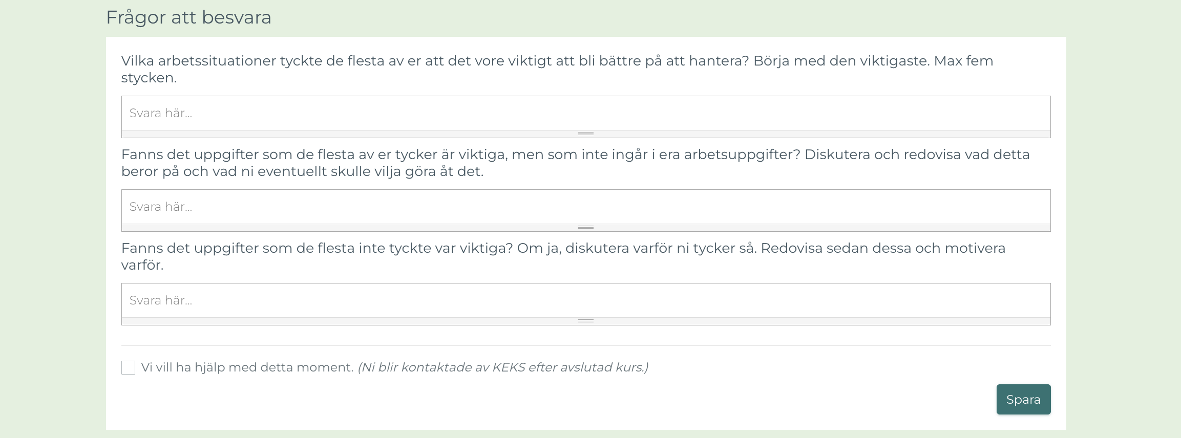 Under varje träff ansvarar gruppledaren för att gruppen svarar på de frågor som finns i momenten. De frågor som ni vill diskutera vidare med någon från KEKS kansli markerar ni genom att kryssa i rutan ”Vi vill ha hjälp med detta moment”. Fortsätt sedan att slutföra kursen. När ni genomfört alla kursmoment och svarat på alla frågor kan ni lämna in kursen för uppföljning. Då blir gruppledaren inom kort kontaktad för att boka in ett möte via Zoom.