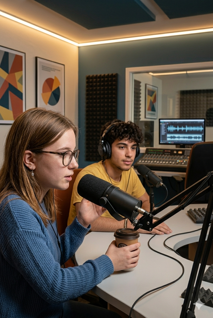 Nora och Yusuf har bokat mediarummet på Solgården för fjärde gången för att spela in sin podd. De ska spela in ett nytt avsnitt och är där i två timmar.