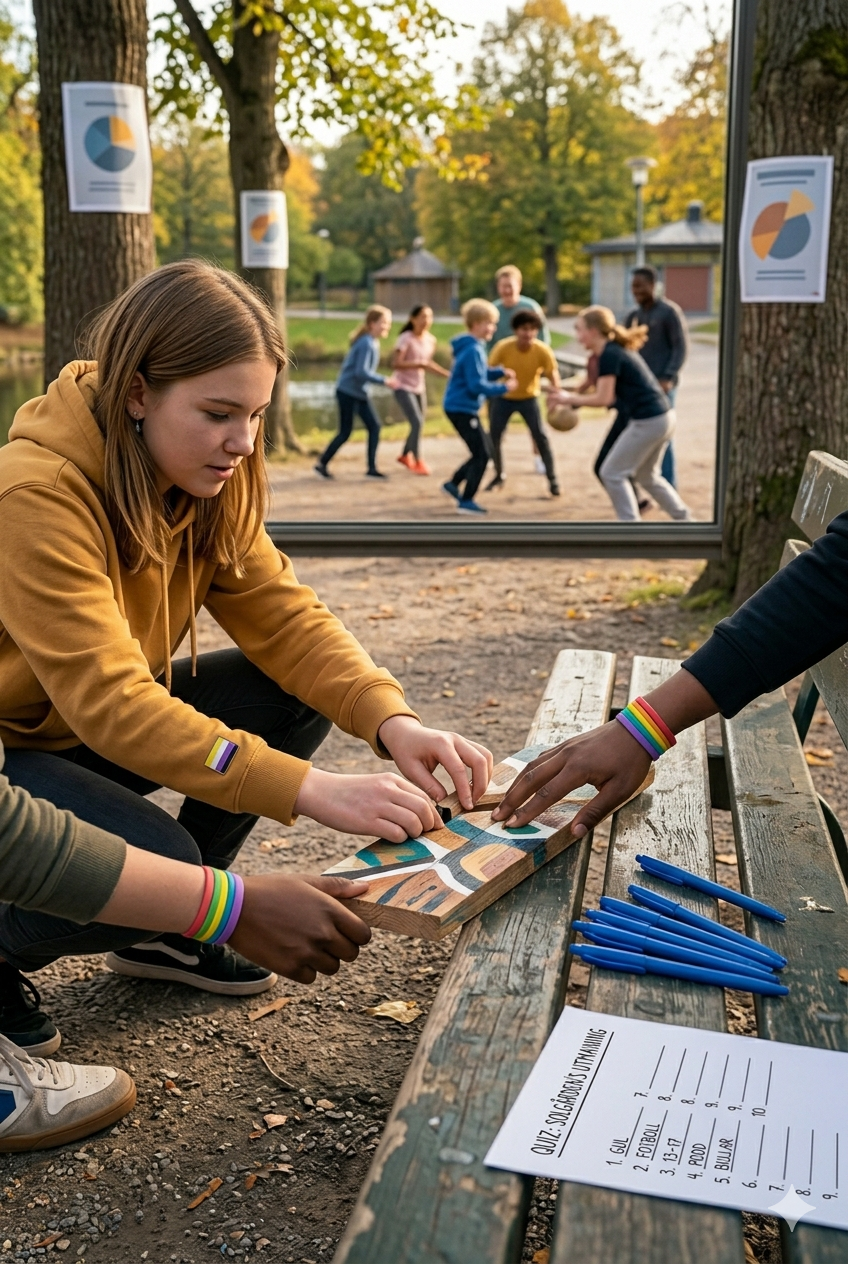 Feriearbetarna kommer med idén att ordna en aktivitetsdag i parken, med musik, lekar och turneringar. De planerar upplägget, delar upp ansvar och håller i aktiviteterna på plats. Personalen stöttar med riskbedömning, material och praktiska frågor.