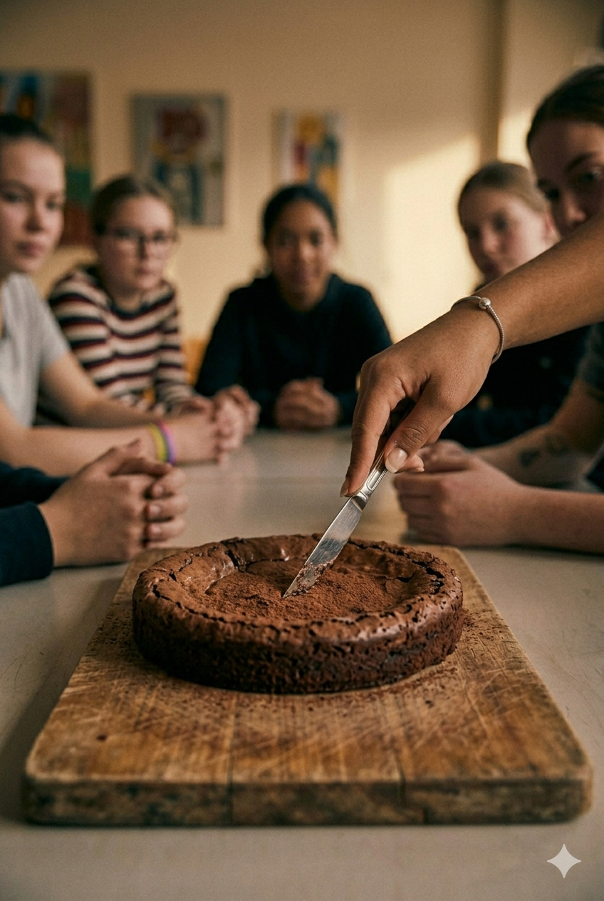 Efter ett tag är kladdkakan klar och delas ut till de andra på Solgården.